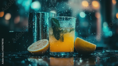 drink, cocktail, beverage, lemon, mint, citrous, summer, refreshing, cold, ice, bar, night, party, liquid, vibrant, yellow, green, splash, water, bubble, glasses, jigger, shaker, fruit, garnish, tasty, delicious, alcohol, alcoholic, mixed, sweet, sour, cool, fun, relaxing, holiday, celebration, photo, image, picture, food, cookery, style, texture, design, background