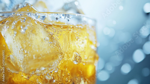 Refreshing Glass of Iced Beverage with Ice Cubes, Perfect for Summer Days and Celebrations, Captured in a Blurry Background with Sparkling Effect