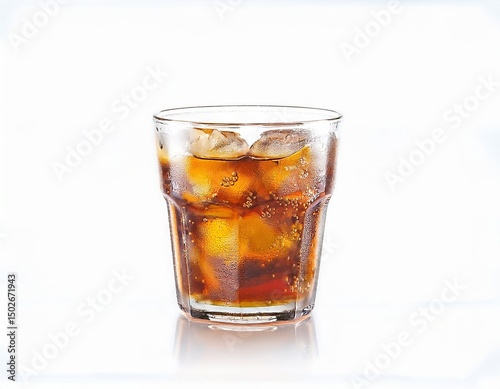 Refreshing Iced Brown Soda Drink in a Glass with Ice Cubes on White Background