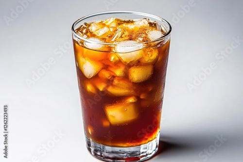 Refreshing iced coffee beverage with ice cubes in a clear glass on a bright background
