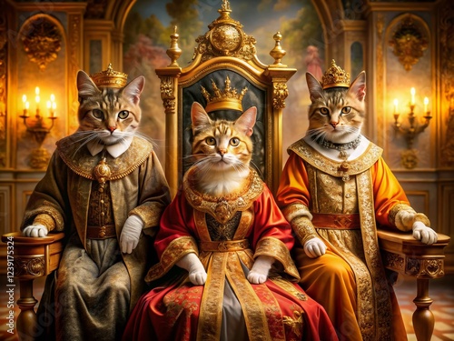 Regal Cats in Royal Robes on Golden Thrones: Luxurious Palace Long Exposure Stock Photo
