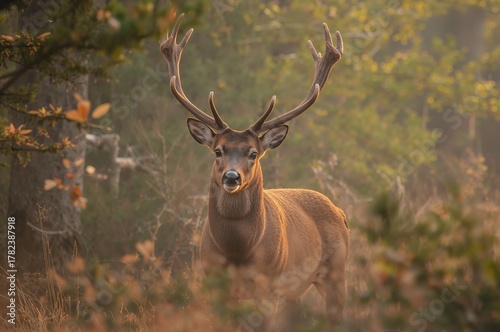 misty, stag, nature, landscape, light, forest, autumn, animal, orange, colours, red, game, colourful, environment, fall, sunrise, beautiful, natural, cervid, mammal, season, wildlife, wilderness, fog, habitat, timberland, wood, twilight, hunting, horn, antler, buck, morning, mist, antler, ruminant, dawn, big, brown, dark, foggy, golden light, majestic, male, grooved, strong