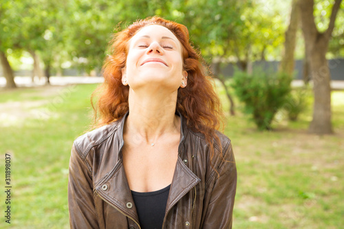 concept, people, woman, lady, female, adult, caucasian, young, casual attire, red, curly, hair, leather, jacket, pretty, model, outside, outdoors, park, green, summer, spring, walk, leisure, nature, lifestyle, forest, day, relax, recreation, turning, face, up, closed, eye, enjoying, relaxed, carefree, smiling, happy, peaceful, serene, tranquil, calm, positive, cheerful, front, view