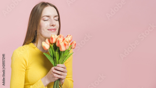 emotion, express, expression, face, experiencing, feeling, girl, human, mood, people, person, woman, smell, flower, bouquet, relax, relaxed