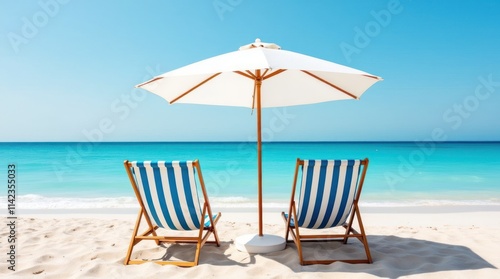 Relaxing Beach Retreat With Striped Chairs Under a White Umbrella