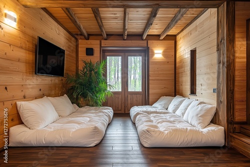 Relaxing Wooden Cabin Interior with Comfortable Floor Cushions and a Flat Screen TV, Showcasing Tranquil Design and Cozy Atmosphere.