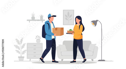 delivery, service, package, courier, home, fast, online, order, shipping, client, box, woman, man, receive, hold, food, cake, house, apartment, room, indoor, living, sofa, plant, decoration, minimal, design, vector, illustration, isolated, lifestyle, person, holding, smiling, happy, modern, trendy, casual attire, style, cap, backpack
