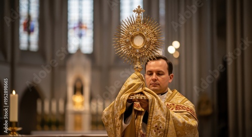 Religious clergyman holding a golden ornate cross during a solemn ceremony inside a cathedral