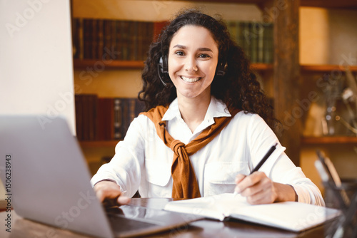 woman, online, course, education, teacher, remote, computer, school, cyberspace, technology, distance, video, call, chat, conference, laptop, lesson, home, class, homework, student, smiling, board, english, virtual, blackboard, university, table, language, studying, happy, sitting, desk, writing, notebook, lady, watching, whiteboard, note, cognition, positive, earphones, earphones, headset, posing, quarantine