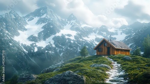 remote mountain cabin surrounded by snow-capped peaks, with a trail leading up to the door