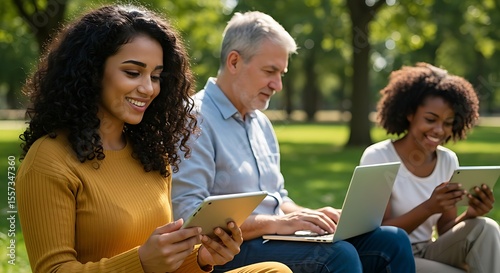 Remote working scene with multicultural people using tablets and laptops in a sunny outdoor park, relaxed yet productive atmosphere