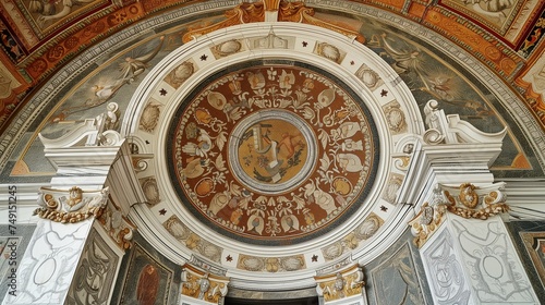 Renaissance palace office, circular marble mosaic with opulent Renaissance art motifs. Background Renaissance opulence.