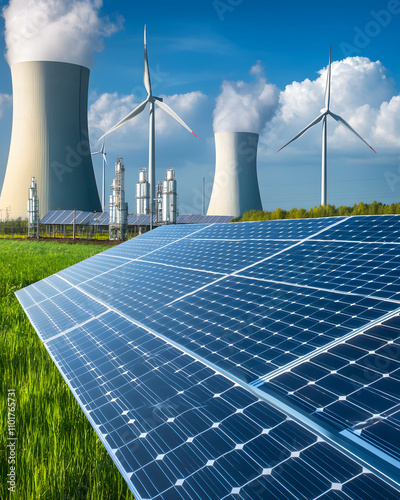 Renewable energy sources including solar panels, wind turbines, and nuclear cooling towers.