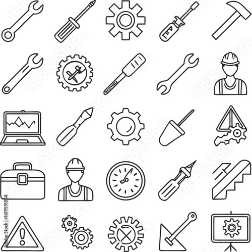 Repair icon set. Containing fix, toolbox, repairman, recovery, setting, restoration, car service, construction, maintenance and more. Editable line icons. Vector illustration.