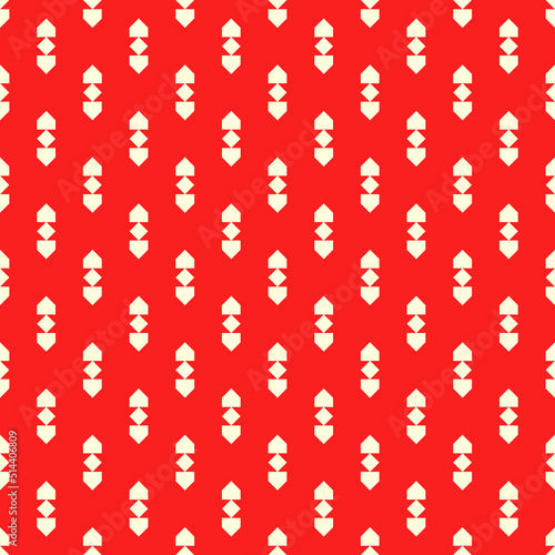 Repeated white figures on red background. Ethnic wallpaper. Seamless surface pattern design with arrows ornament. Rhombuses and pentagons motif. Digital paper for textile print, web designing.
