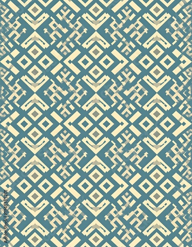 Repeating geometric pattern with diamond shapes in blue, beige and grey on beige background