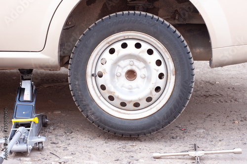 replacement of wheels on the car.Lifting the car with a Jack