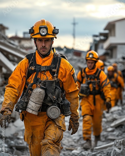 Rescue team in yellow and orange uniforms walking through earthquake ruins, navigating rubble, showcasing bravery, disaster response, and emergency relief efforts