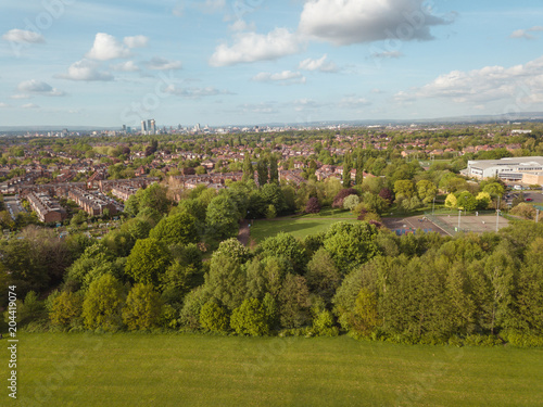 Residential houses drone above aerial view blue sky with park and greenery