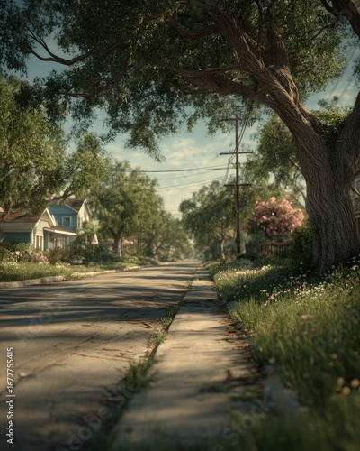 street, road, tree, house, suburb, neighbourhood, residential, landscape, nature, daylight, sunny, green, blue, pink, flower, plant, grass, sidewalk, path, calm, peaceful, quiet, idylli, summer, exterior, view, perspective, foliage, urban, city, town, area, day, warm, light, vintage, retro, realistic, digital, art, illustration, three-dimensional, park, empty