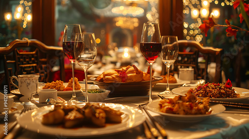 eatery, food, dinner, table, wedding, glasses, setting, party, banquet, wine, plate, dining, decoration, napkin, celebration, knife, tablecloth, reception, interior, event, fork, luxury, meal, drink, cutlery