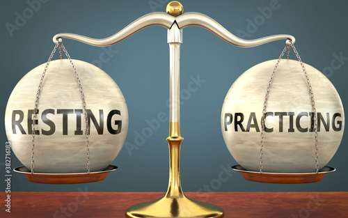 resting and practicing staying in balance - pictured as a metal scale with weights and labels resting and practicing to symbolize balance and symmetry of those concepts, 3d illustration
