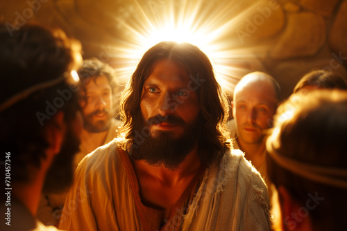 Resurrected Jesus Surrounded by His Apostles, Celestial Light Shining upon the Messiah's Return