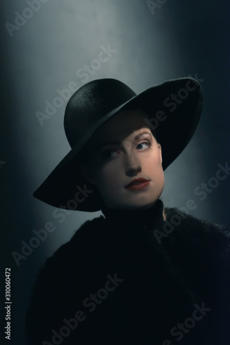 chic, hat, retro, vintage, black, thriller, dark, mystery, eerie, make-up, cosmetic, model, hollywood, woman, 1940s, style, fashion, girl, female, beautiful, caucasian, lady, pretty, portrait, nostalgia, young, glamour, studio, classic, coiffure, attractive, beauty, gorgeous, stylish, fashionable, sensual, elegant, hair, 1930s