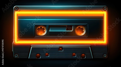 Retro cassette tape with glowing neon frame on dark background, nostalgic vintage music concept