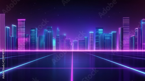 city landscape, neon, city, night, futuristic, retro, 80s, 90s, digital artwork, background, illustration, neon light, glowing, skyscraper, architecture, urban, fantasy, science fiction, grid, line, purple, blue, dark