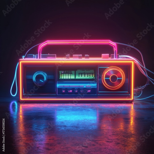 retro, neon, glow, audio, music, player, vintage, classic, dark, light, vibrant, electric, futuristic, technology, equipment, design, abstract, digital, render, graphic, object, style, 80s, pop, culture, sound, stereo, radio, cassette, portable, reflective, surface, illumination, disco, party, nightclub, entertainment, colourful, magenta, cyan, purple, blue