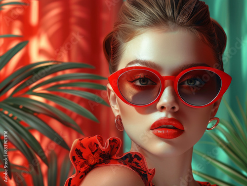 woman, summer, vacation, fashion, sunglasses, retro, vintage, collage, poster, generative, ai, beauty, face, hair, model, goggles, glamour, lip, mask, carnival, person, style, people, fun, make-up, red, 1, lady, outdoors