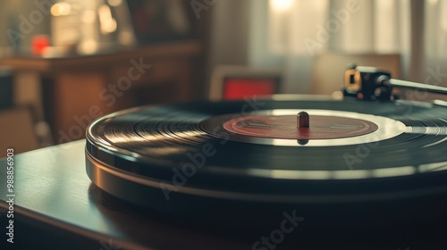 Retro turntable playing a vinyl record, with iconic pop rock albums in the backdrop, evoking a sense of timeless music and warm nostalgia.