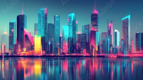 Retro-futurism cityscape with colorful skyscrapers along a river, captured in a cyberpunk style with a dynamic, futuristic vector background