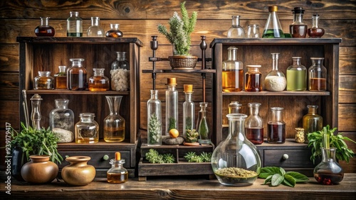 Retro-style apothecary display showcases ornate glass vials filled with aromatic liquids, surrounded by antique medical equipment and vintage botanical illustrations on a distressed wooden shelf.