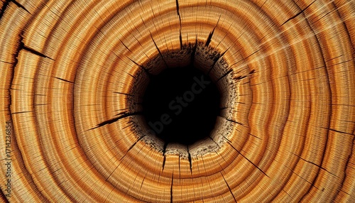 Revealing the passage of time through the concentric rings of a weathered tree trunk with a mysterious dark void center