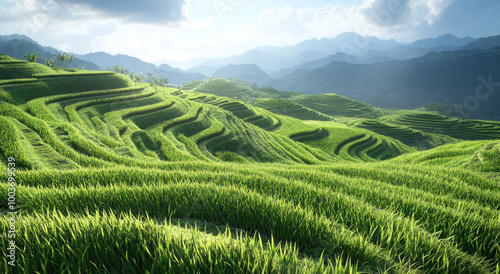 Rice terraces, lush green rice fields, terraced landscapes, stunning natural scenery