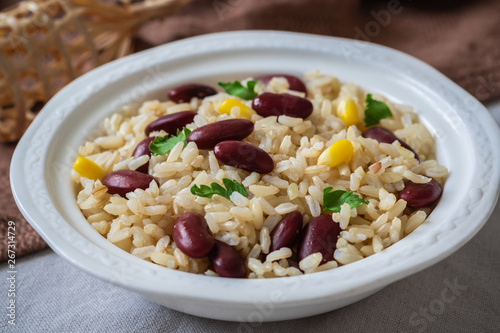 bean, bean, boiled, bowl, brown, cooked, corn, cookery, delicious, diet, dinner, eat, food, epicure, grain, health, healthy, kidney, legume, lunch, meal, napkin, natural, nourishment, organic, red, rice, seed, spoon, steamed, tasty, vegan, vegetable, vegetarian, white