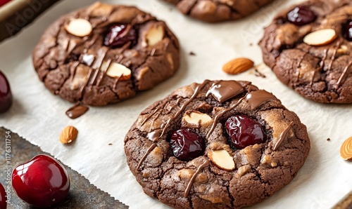 Rich dark chocolate cookies doped with almonds and cherries, Generative AI