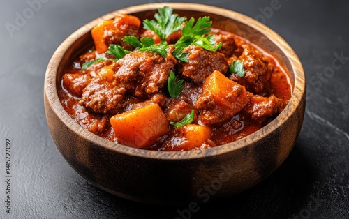 Rich, dark red goulash in a rustic wooden bowl, garnished with fresh parsley. The stew features tender chunks of meat and vegetables against a dark background
