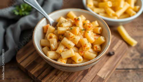 Rigatoni Pasta Bowl with Fresh Herb Garnish and Cooking Utensils on Wooden Surface – Cooked vs. Uncooked Ingredients for Food Blogs or Recipe Content