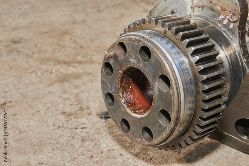 Right Frame Zoom Side View Crankshaft Gear of Truck Engine on Concrete Floor