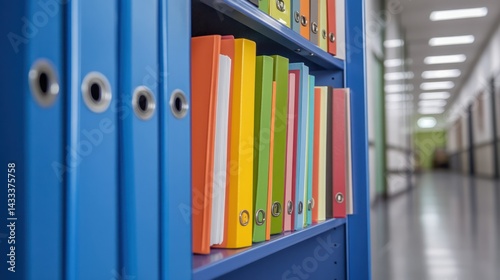 Ring binders stand arranged on shelf colorful paperwork organized, business documents neatly filed for reference.