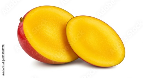 mango, fruit, tropical fruit, half, sliced, juicy, ripe, yellow, flesh, summer, food, healthy, vitamin, dessert, snack, sweet, exotic, delicious, freshness, organic, ingredient, photo, studio shot, white background, isolated, closeup, texture, vibrant, colours, appetising, summer fruit