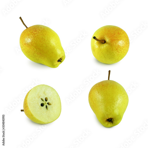 Ripe juicy yellow pear, set of different angles and cross section isolated on white background