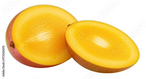 Ripe mango fruit isolated on transparent background, tropical fruit cut in half for healthy eating and exotic food