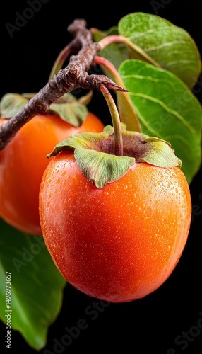 Ripe Persimmons on Branch, Vibrant Orange, Glossy Skin, Black Background, Studio Shot