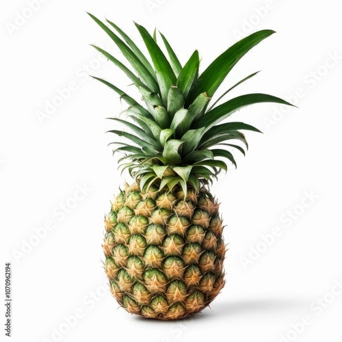 Ripe pineapple with fresh green leaves on empty white background