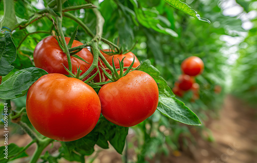 Ripe tomatoes growing on the plant in a greenhouse, tomato
