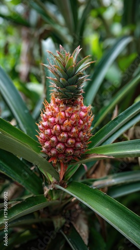 Ripe, vibrant pineapple growing amidst long, green leaves and natural foliage